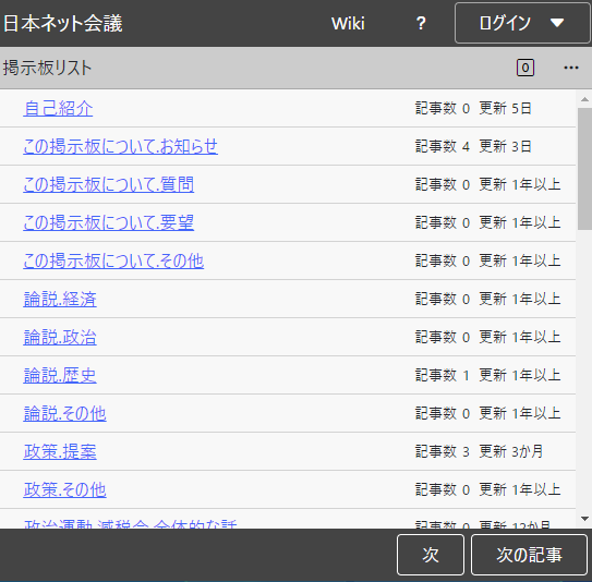 日本ネット会議の掲示板は、分野ごとのたくさんの掲示板と 掲示板内の記事で構成されています。